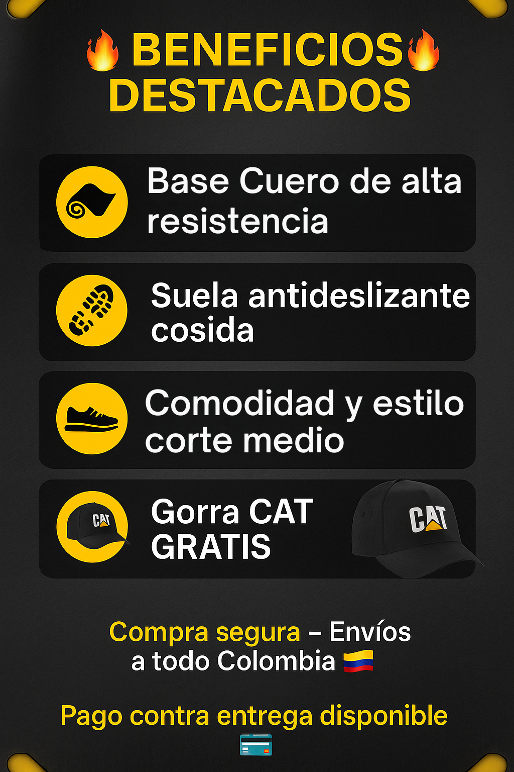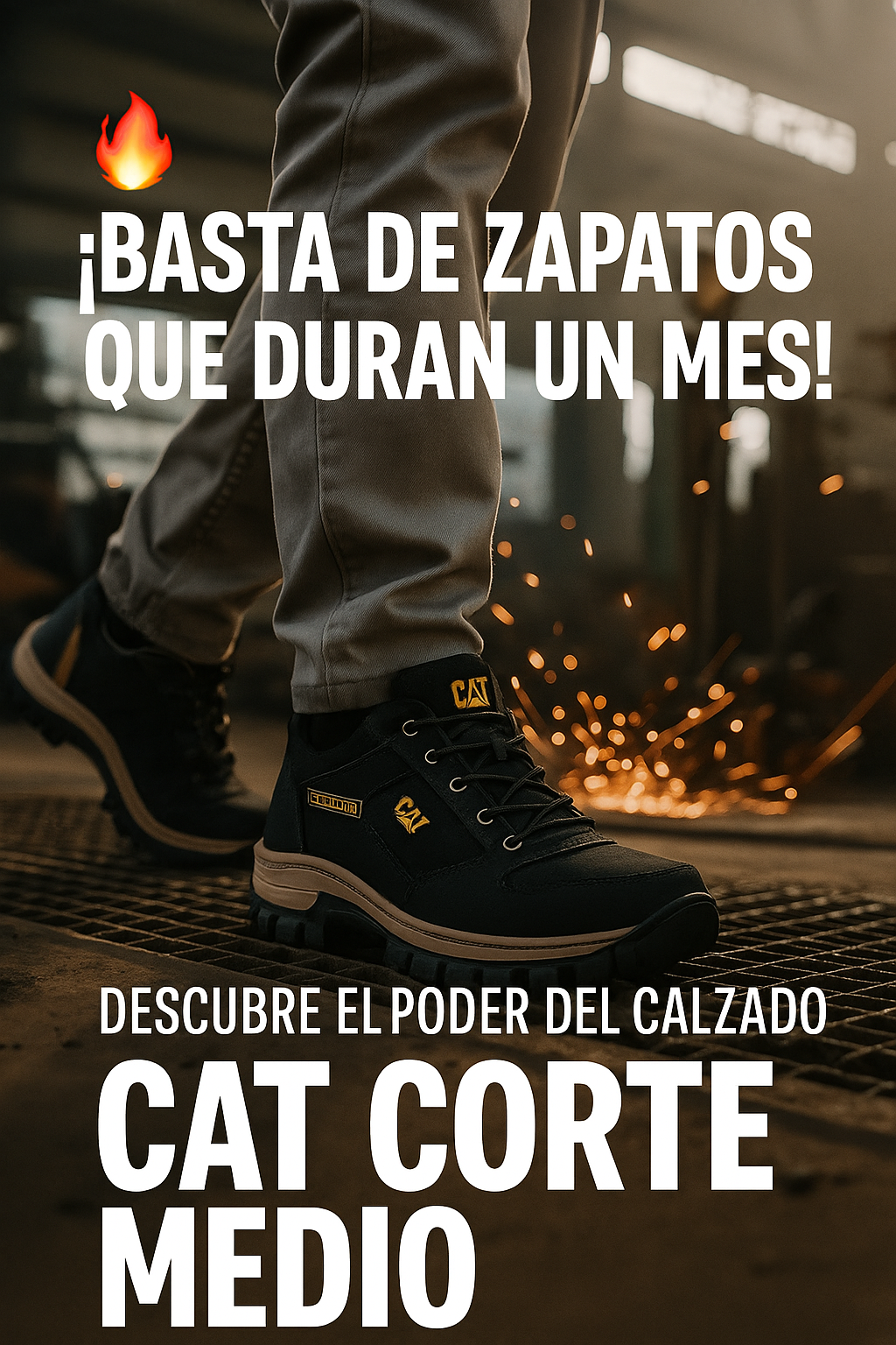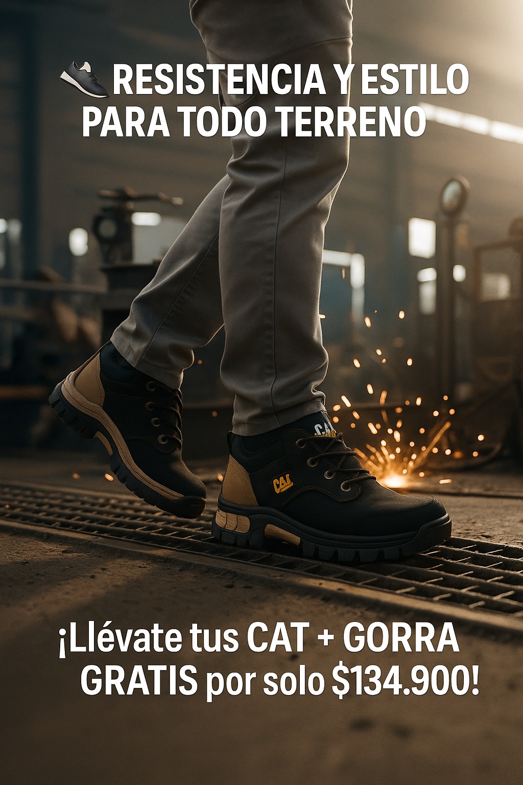 Nuestros zapatos son CAT Corte Medio de alta calidad, elaborados con base de cuero y suela inyectada bicolor antideslizante, garantizando resistencia y durabilidad similar a la línea original.