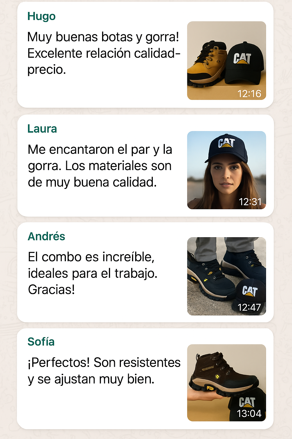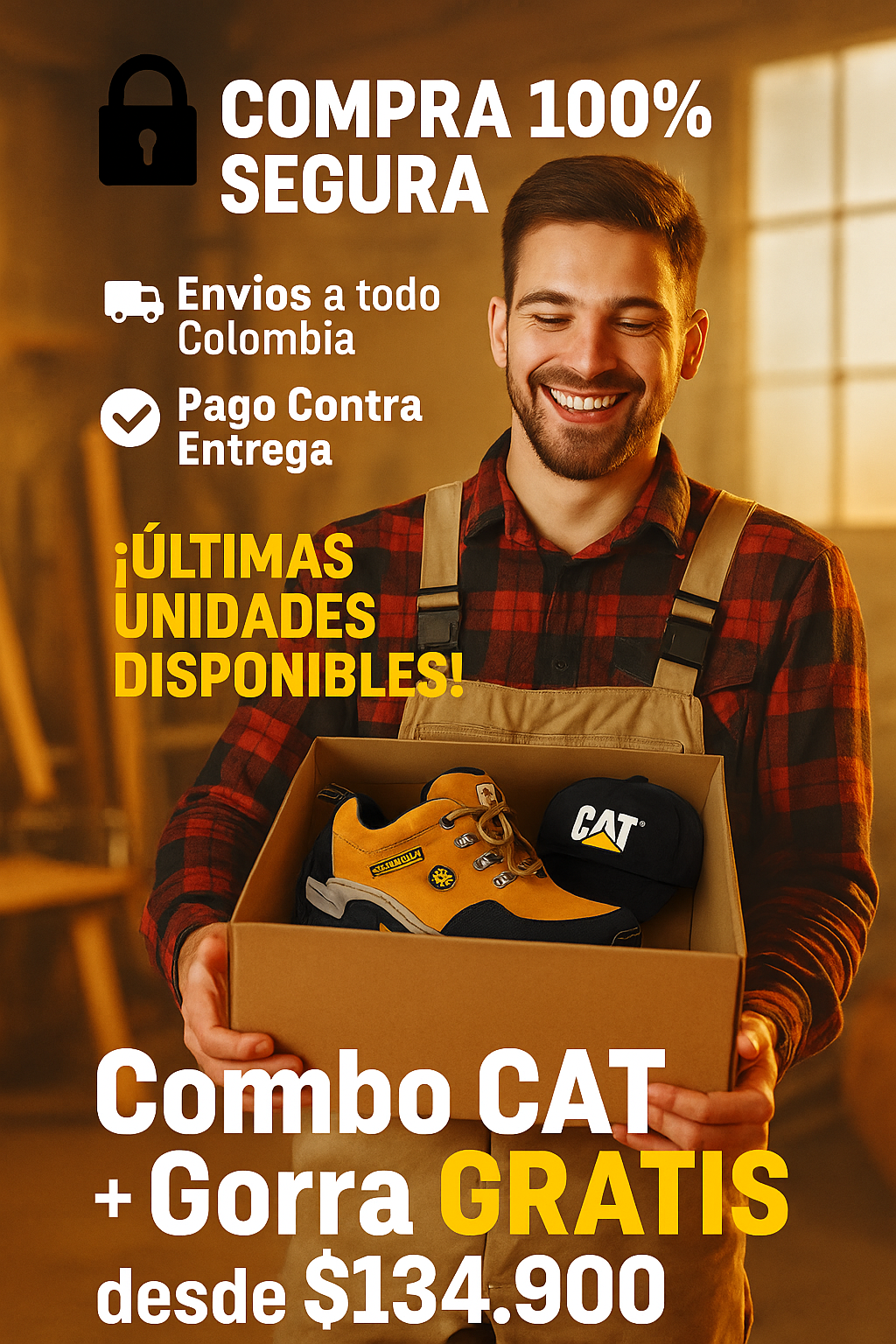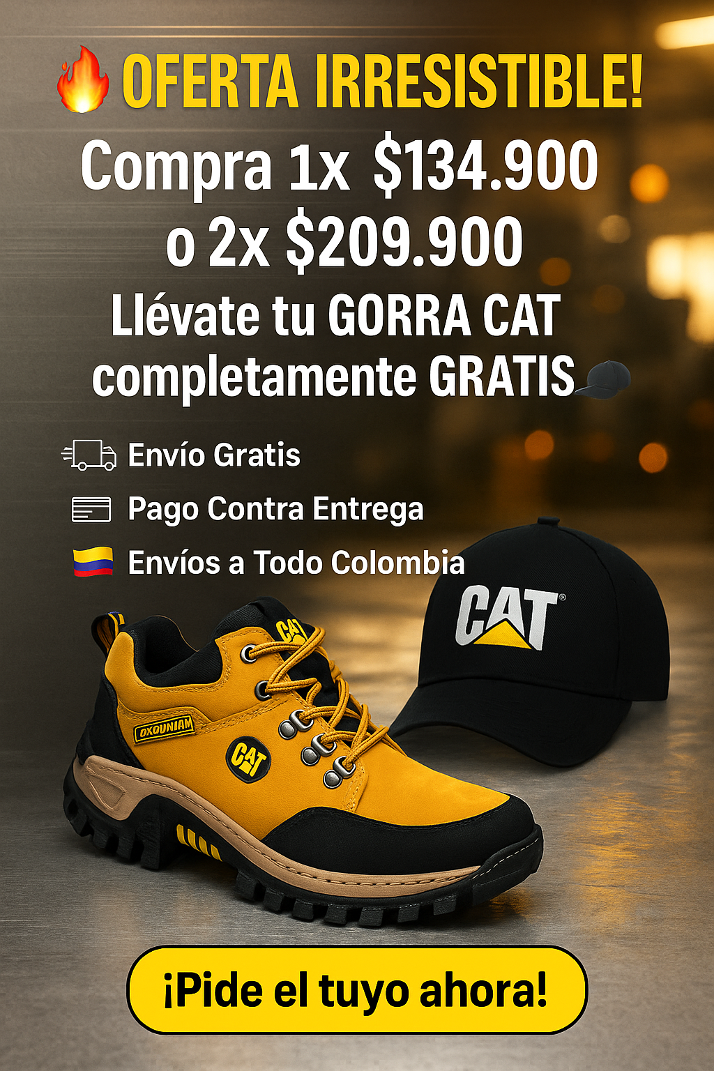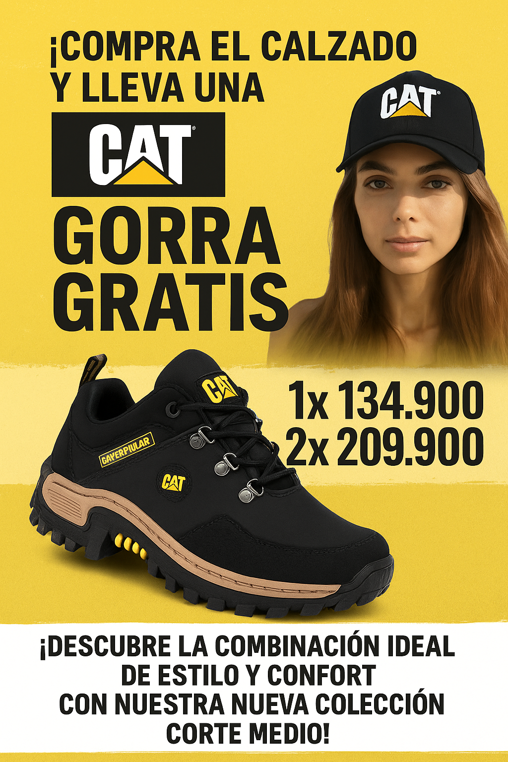 Nuestros zapatos son CAT Corte Medio de alta calidad, elaborados con base de cuero y suela inyectada bicolor antideslizante, garantizando resistencia y durabilidad similar a la línea original.