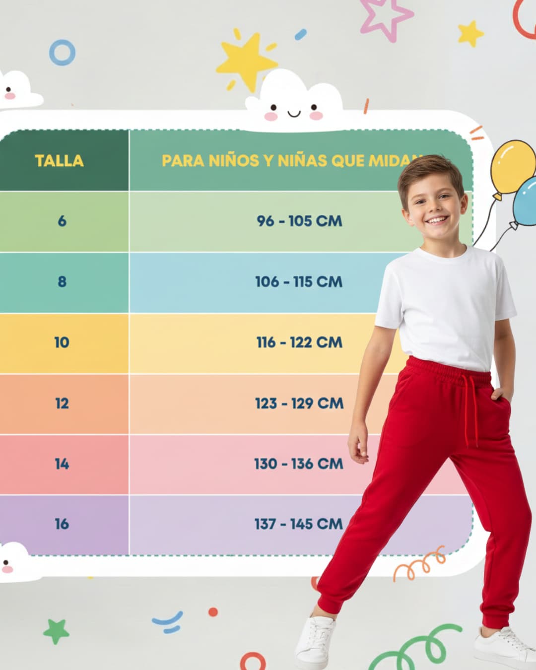 Contamos con tallas desde la 2 hasta la 16. Puedes guiarte por la edad del niño o consultar nuestra tabla de medidas. Si el niño está entre tallas, recomendamos pedir una talla más grande.