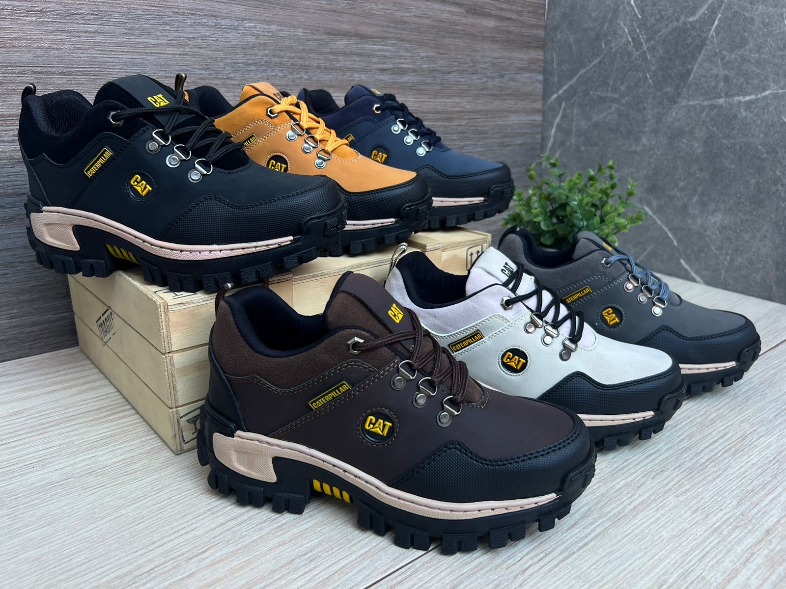 ?? NUEVA COLECCIÓN CAT CORTE MEDIO?? Material: sintético base cuero importado con punta y cuello en sintético PVC. Marquillas: en caucho inyectadas en PVC bicolor, marca en la lengüeta repujada. Suela: CAT tipo original en espanso, pintura PVC con línea de costura. Cordoneras: en riata con doble costura para mayor duración. ?TALLA: 37 AL 43?